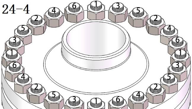 首先,我們來優先了解一下四同步液壓扳手預緊管殼式換熱器法蘭螺栓的螺栓編序。可以參照下圖,將法蘭螺栓總數平分為四部分,每一部分選第一顆作為定位螺栓編序號“1”,編號“2”取每組最中間螺栓,下來的編號都是取每次平分之后的中間螺栓依次編號直到編完為止。