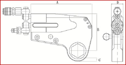 中空液壓扳手的局限性也有,比如說有些使用單位希望用一個工作頭來實現多種工況螺母工作,這個時候他們會選擇襯圈增加使用范圍。但是,增加襯圈會增加工作頭的厚度,也就是下圖中的C值變大:
