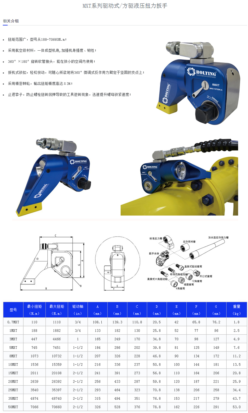 BOLTING品牌提供優質的工業工具組合:液壓扳手、螺栓拉伸器、液壓泵站、力矩倍增器、電動扭矩扳手、氣動扭矩扳手、液壓拉馬、液壓壓床、法蘭分離器、螺母破切器等多種類的產品,滿足各種客戶應用要求。